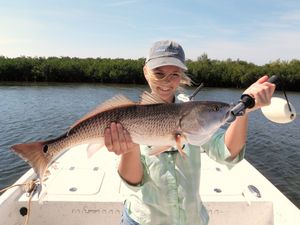 Checkout Danielle with her windy day Redfish. This was just one of 3 slob Redfish she caught on the afternoon.