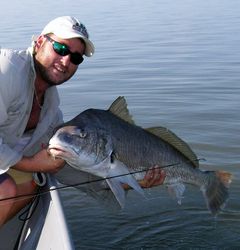 A few days ago I came across a HUGE school of big black drum all of which were pushing 30 pounds plus working a deeper area along the rocky bank. In three feet of water these fish are big enough to have their backs and tails exposed while they feed. The first day I fished them we used live shrimp and we very unsuccessful. On the next trip I decided to bring a few live blue crabs. But before using them for bait I smashed them a little to release a little scent. With in a few minutes of push poling in this area my buddy Dan Kramer was able to hook up with a 25 pounder. After a fairly exciting fight in 3 foot of water he was finally able to land the fish. On 6 pound Spiderwire with a 30lb Berkley Big game leader these fish put up one heck of a fight.