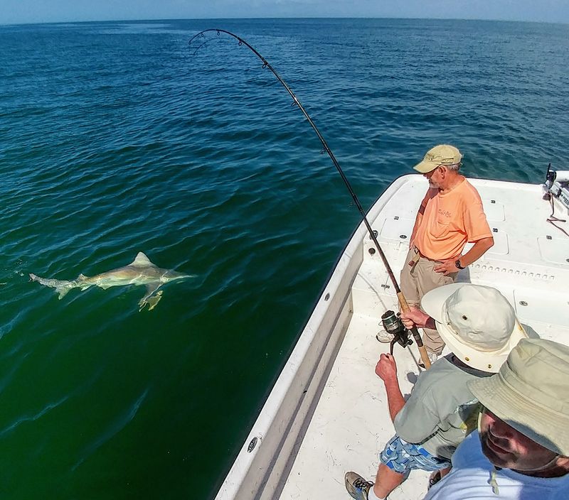 If targeting these baits schools sounds like a blast anglers must remember that Huge Redfish are not the only predatory fish following these schools this time of year. Speckled Trout, Snook, Spanish Mackerel, Bluefish and Sharks will all be on the hunt as well. Targeting the varieties of Sharks that venture closer to shore these days are a high priority on most of my charters this time of year. There is nothing like watching that Jaws moment where a shark’s fin protrudes out of the water making its way to a large piece of cut bait at the end of your rod. Bull Sharks and Blacktips will be the most abundant sharks over the coming weeks but anglers are often shocked when they set the hook on a Shark only to find out that it’s a Hammerhead, Tiger or my favorite the Spinner shark. The beauty of Shark fishing is that they all put up a great fight and most if not all are released to fight another day.