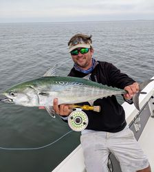 The beauty of fly fishing for False Albacore is that long casts are often unnecessary, because Albacore can erupt right under your boat. However, anglers who can throw a long line with a tight loop have an advantage when it is necessary to punch a fly into a stiff breeze. More important than distance is the ability to cast quickly and accurately. Anglers who can cast quickly in all directions using both the forward cast and backcast to deliver the fly will be most successful in this run and gun style of fishing. Albacore move quickly, slashing and turning. They do not (like Bonefish or Redfish) move by slowly waving their tails in the air.