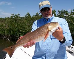 The highlight of my charters in recent weeks has been an inshore slam that Dave Preston and I performed using nothing but artificial lures provided by Pure Fishing Inc.. We started out our charter chasing tailing redfish in less than two foot of gin clear water and to our amazement we were spoiled when we watched a keeper Snook come out from a Mangrove and inhale a Johnson Spoon. The best part of it all was that the Snook actually had to charge through a school of tailing Redfish to get to the bait. Talk about exciting! After catching and releasing the Snook we proceeded to make a short run south in search of some bigger redfish on some hard bottom way back in some back creeks. The first stop we made didn’t reveal any Redfish until we came across a school in the back of a creek that was no wider than an average size swimming pool. The first cast my client Dave Preston made with his Johnson Spoon landed right in front of a beautiful 26 inch Redfish’s face and the fight was on. After an awesome fight that fish was also released. Now with both the Snook and Redfish out of the way we concentrated on catching a Speckled Trout to complete our first West Coast Slam of 2008. Within minutes of stopping on a shallow flat with tons of potholes, Dave made a perfect cast with a Berkley Gulp and was rewarded with a beautiful 17” Speckled Trout. What a Day!!!