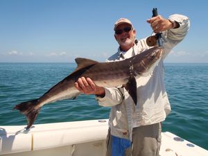 As incredible as the Spanish Mackerel and Shark Fishing has been, the real surprise has been the large schools of Cobia that have been roaming our flats and staking claim to some of the areas local structures. When targeting Cobia my favorite structures to target are Channel Markers, Crab Buoys, and Rocky Structures adjacent to sandy bottom. On a recent trip with Jay and Nancy Allen of Leesburg we targeted 2 large sandy areas adjacent to sponge beds and coral flats and were rewarded with a 10 fish day featuring 4 Cobia that would have fell into the 33” slot with 2 of the fish exceeding 40” (30lbs). Sandy areas make a great habitat for cruising Rays (which normally have Cobia following them this time of year). It may be hard to believe but the baits of choice for targeting these fish are small catfish with their fins clipped.