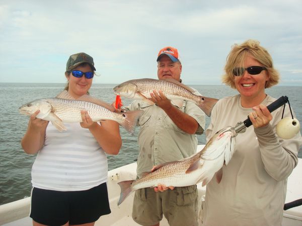 Hannah, Mike and Bobbi released over 30 keeper Redfish on the day. This was the result of one of the many multiple hookups we had on the day!!