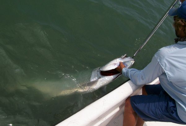 Now from a fish that gets down a dirty to a fish that Jumps and Jumps and Jumps. TARPON!!! This word alone is enough to send shivers up and down a tarpon angler’s spine. During a recent Poon Stalking Trip, Ron Poisker of Maryland and I spent 2 days in search of the Silver King and boy did we have a blast between the trips. On day one we spotted 40-50 Tarpon all hovering in weight from 40-170lbs. On this day we were not fortunate enough to convince any of these Poons to bite but Ron was able to see a Free Jumper pushing 150lbs jump 30 feet off our bow. This fish alone gave him the fever and made him even more determined than ever to hook up with one of the giant Poons our area is known for. Day 2 was definitely Ron’s day. We headed out the river around 8:00 a.m. in the morning and the air just smelled fishy. On our way down the river we spotted at least a dozen Tarpon rolling in the river which helped to give us confidence for the approaching day. AS we settled into our spot we notice another Poon stalker hooked up with what looked to be a 100+ pound fish. He fought the fish for at least 45 minutes before the fish was eventually landed and released. Finally 1 for the fishermen.