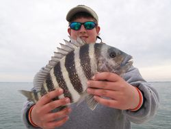Although the Redfishing has been Great, the impending Sheephead bite will be even better. During this time of year many Sheephead venture to areas of rock and areas with tons of crab to lay there eggs. Oysterbars, rock flats, and rocky ledges tend to be the most productive and hold the most fish. Because our local waters are so clear this time of year sight casting to these huge schools of sheephead is a great way to catch these tasty fish. I like poling my ActionCraft around many of the oysterbars and rock outcroppings while my clients pitch live shrimp or pieces of crab at these fish. The key is when one sheephead is spotted throw as many rods as possible in the same general area. In the summer time these fish tend to be loners, but during the winter schools of 30-50 fish are not uncommon.