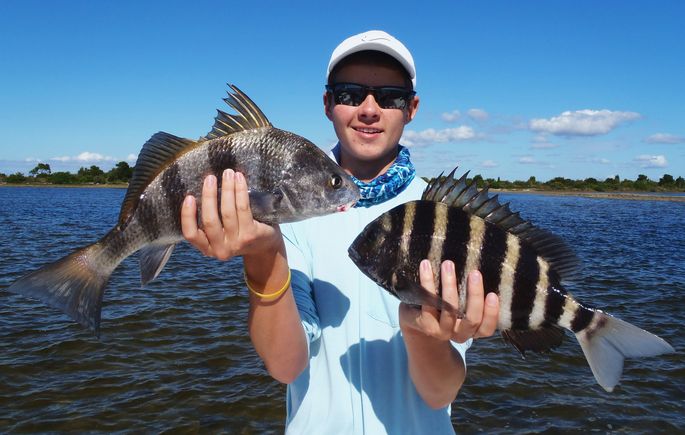 Andrew is proudly showing off his nice Black Drum and Sheepshead combo that he landed on back to back casts.