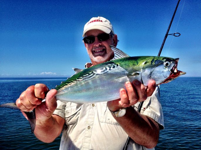Hands down one of my favorite fish that swims our local shallow waters are Bonita. As a member of the Tuna family these fish are built for speed. When these fish make their fall arrival they tend to arrive in force and are willing to eat any bait fish that moves. This time of year with some of our local bait pods approaching acres in size, Bonita have more than enough prey to pursue. An added bonus when fishing these huge schools of feeding fish is that you never know what other types of predatory fish may show up in the fray. Cobia, Tripletail, Mackerel, Bluefish, Huge Jacks, and a variety of Sharks are just a few of the other visitors one can expect when running and gunning from feeding frenzy to feeding frenzy.