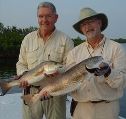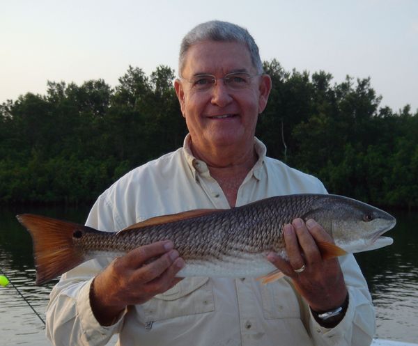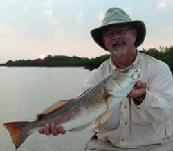 Well it just so happened that these fish were tailing and feeding on what ever swam, crawled or wobbled on by. When I pulled into this area I first noticed that the feeding redfish had pushed a giagantic school of mullet along the bank of a Mangrove shoreline. The next thing I noticed was that the redfish were feeding just off the rocky bottom of the shoreline, almost where the rock met the sand. As soon as our first three casts with shrimp hit the water WHAM! To my amazement we had a limit of redfish within our first three casts. When this happens it is usually all fun and games for the rest of the day, but in all reality that is when the real work began. For over an hour we made cast after cast landing over 40 redfish from just within the slot to just over it. These fish were feeding on everything early that morning. We started jigging shrimp on a ¼ ounce Cotee Jighead through them and that was a no brainer. As soon as the shrimp hit the water these reds were all over it. To mix up the action a little Guy brought along his 8-weight fly rod for situations just like this. Guy’s first throw with his shrimp imitation fly landed him a beautiful 18-inch keeper redfish. If you have never seen a redfish come full speed for a fly, there is nothing like it other than watching a redfish nail a topwater lure.